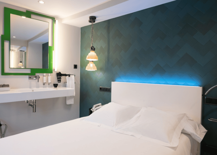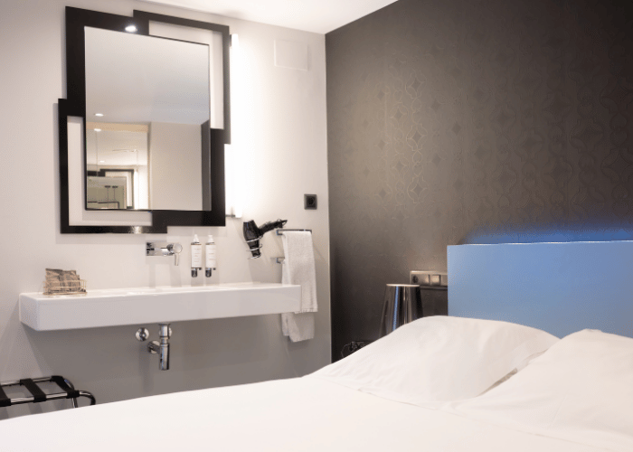 Tiene un toque único, funcional y personal ya que no hay dos iguales y prueba de ello es su moderno lavabo de diseño situado al lado de la cama.